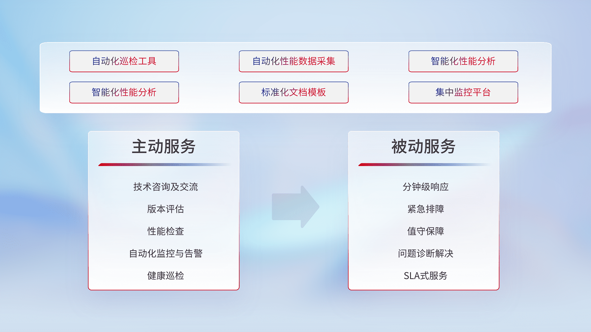 智能化工具和标准化文档,,,保障服务质量,,,提供主动服务(包含技术咨询、、版本评估、、、、性能检查、、、自动化监控与告警、、健康巡检)和被动服务包含(分钟级响应、、、紧急排障、、、值守保障、、、问题诊断解决、、、、SLA服务)。。。